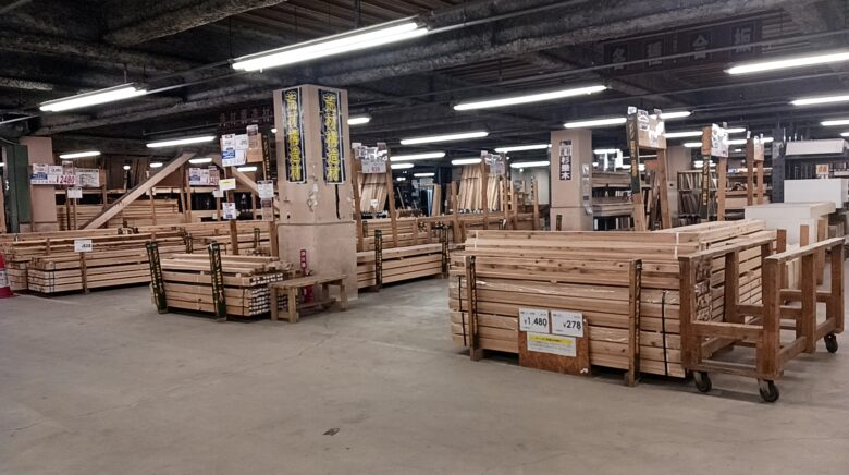 普通の店では扱っていないような、太い角材や長尺の単管パイプ、さらにはプロが使う合板の種類まで、新宮店よりも一回り上のラインナップです。